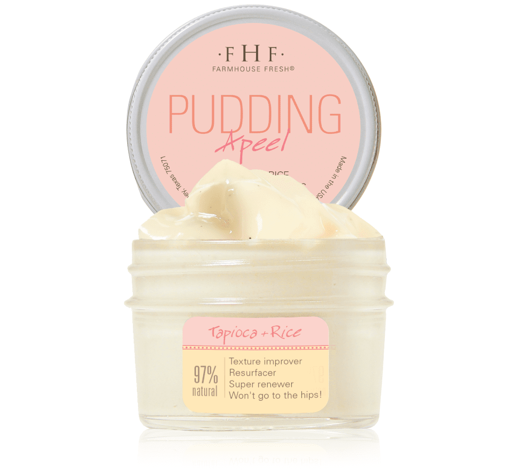 As we age, our cell turnover rate and natural exfoliation process slows down. Exfoliation removes dull-looking, old surface cells, and Pudding Apeel® is designed to do just that! Glycolic and fruit extract Alpha Hydroxy Acids combine with hydrating honey and coconut milk to infuse skin with moisture as you renew. Tapioca provides a silky feel to skin. Added green tea and honeysuckle extracts help soothe irritations. The exfoliation process also aids in the control of acne and helps improve the look of sun-damaged and aging skin.