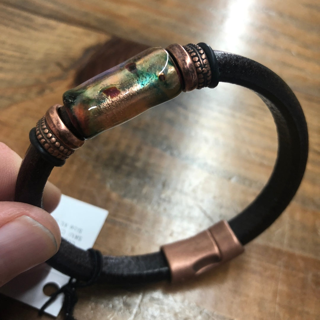 Handmade in the USA, enameled beads in vibrant colors paired with genuine solid leather bands. Copper accent beads and magnetic locking clasp.